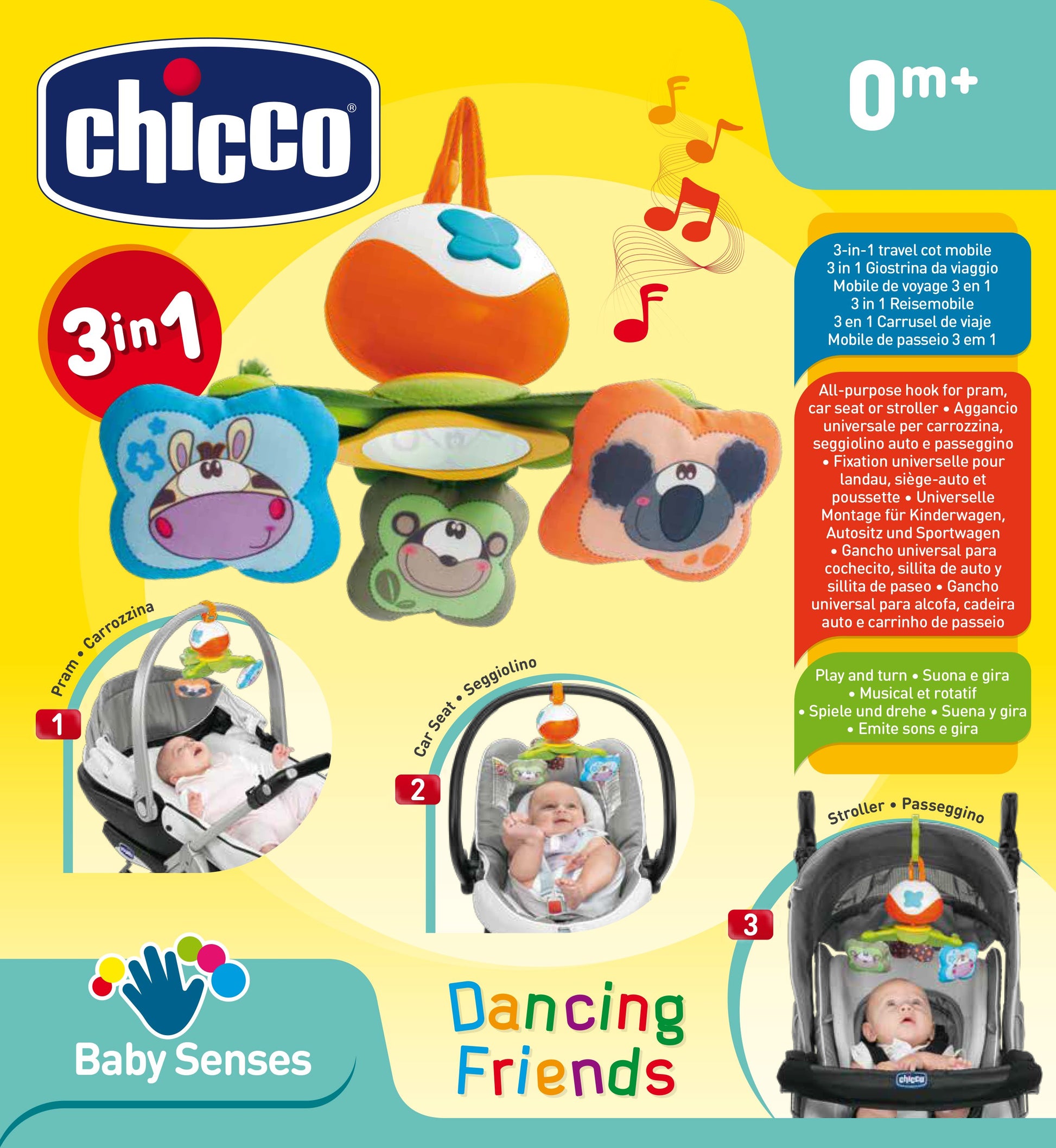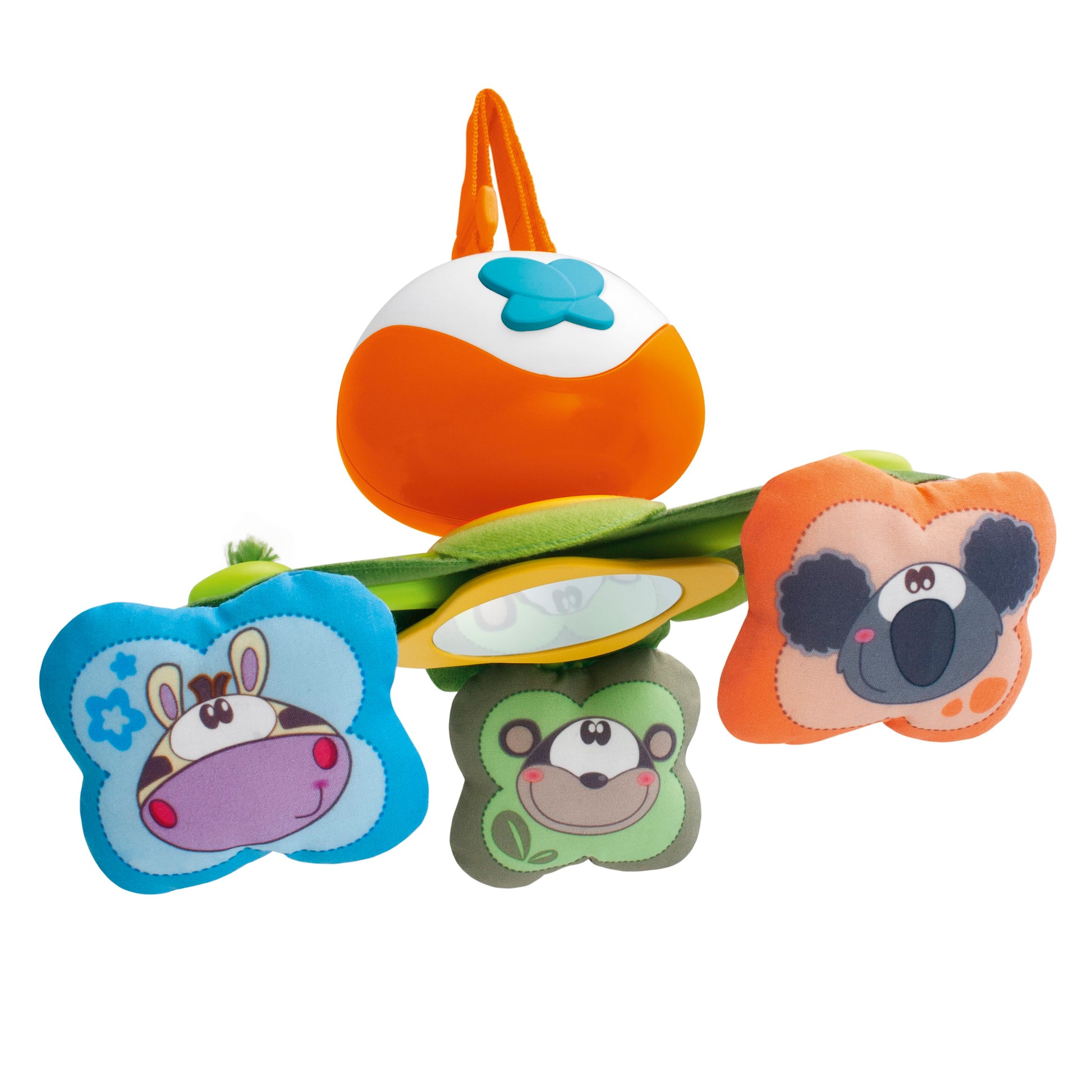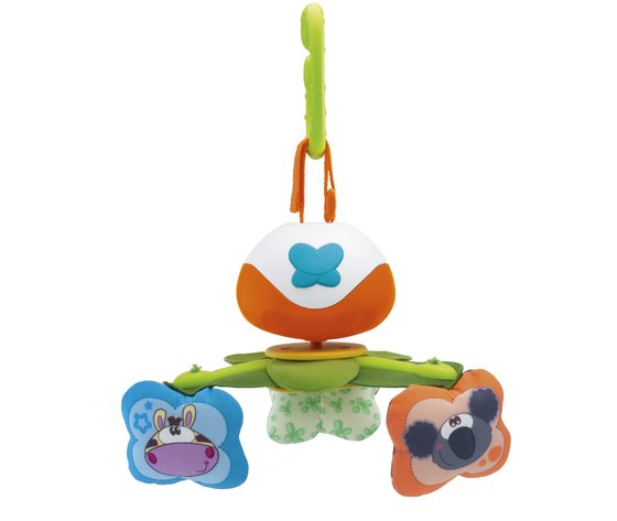 La giostrina Dancing Friends a carica manuale trasportabile, leggera e sicura, con doppio sistema di aggancio universale per fissare la giostrina a qualsiasi carrozzina, passeggino o seggiolino auto.Il carillon musicale è completo di uno specchietto e 3 soffici pendenti.