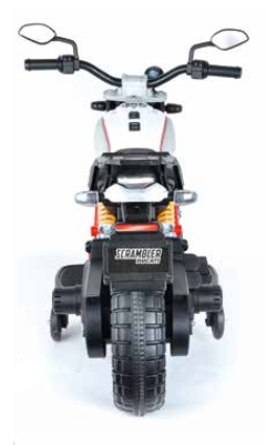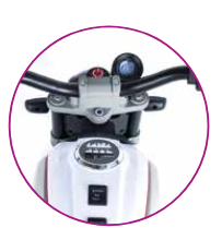Due ruote con stabilizzatori. Marcia indietro. Batteria 12V 3.5Ah. Luci anteriori e posteriori, lettore musicale multifunzione con controllo del volume, pulsante di accensione, display di alimentazione, due velocità, avvio lento. Due