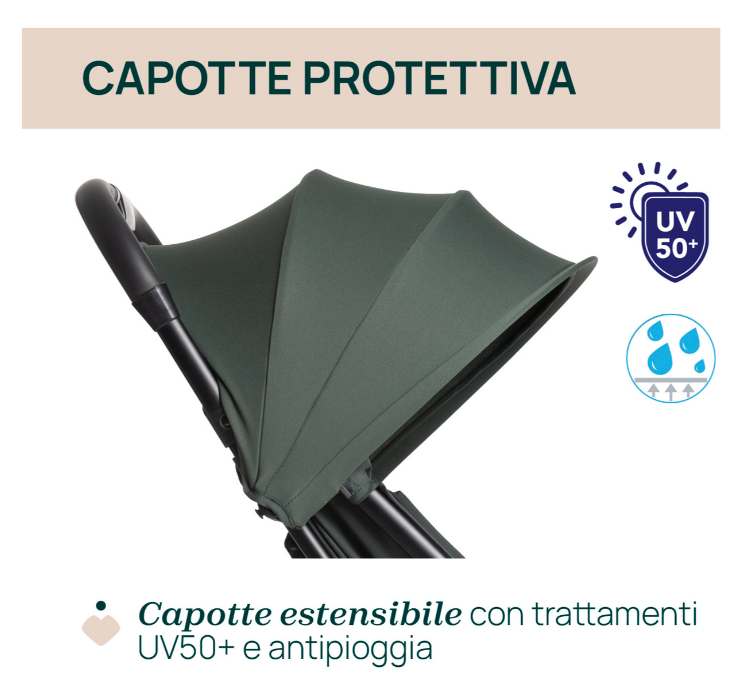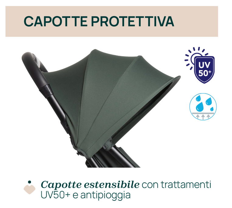 - Comfort garantito: la seduta accogliente e la capotte parasole offrono al bambino protezione e relax.
